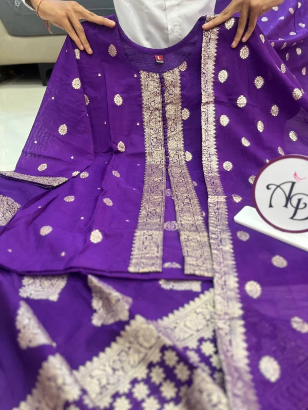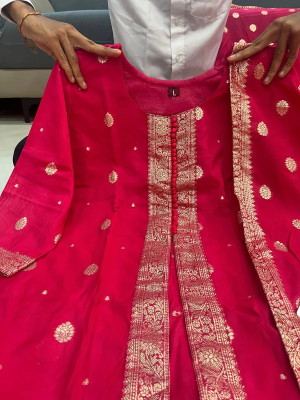 - **Premium Banarasi Fabric:** The entire set is crafted from authentic Banarasi Silk, renowned for its lustrous shine and fine quality.