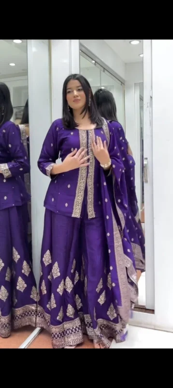 Step into the festive season with a touch of timeless elegance with our **New Designer Dhawani Banarasi Sharara Set**. This exquisite ensemble is a perfect blend of traditional craftsmanship and modern design, making you the centerpiece of any special occasion. Crafted from premium Banarasi Silk, this sharara set promises not only a stunning look but also a luxurious feel against your skin. The intricate Jequard weaving adds a layer of rich texture and detail, showcasing a heritage art form that is both classic and captivating.