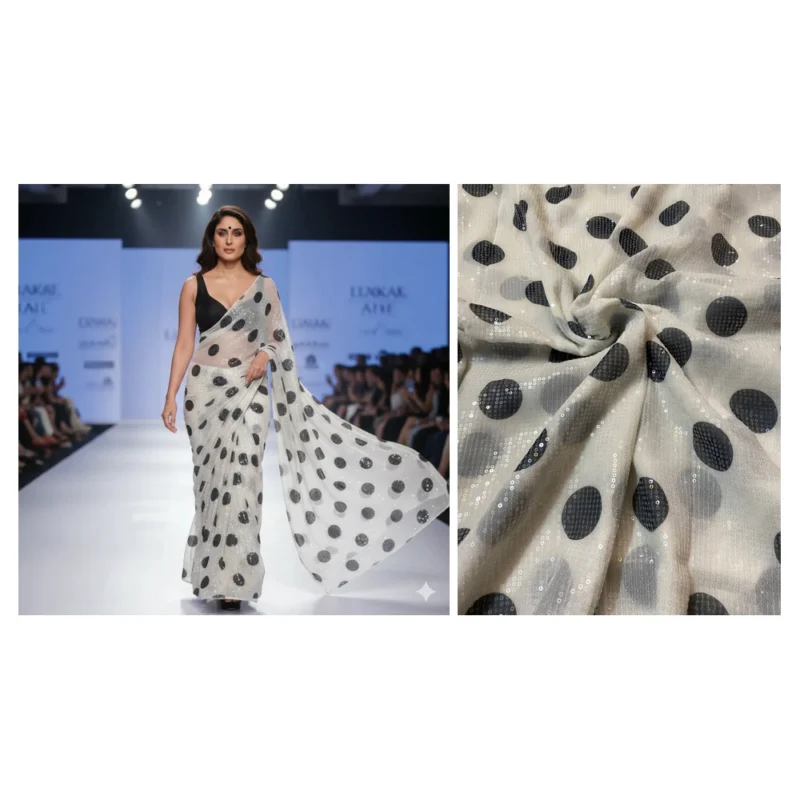 This exquisite material features a timeless black polka dot digital print, enhanced by delicate water sequins