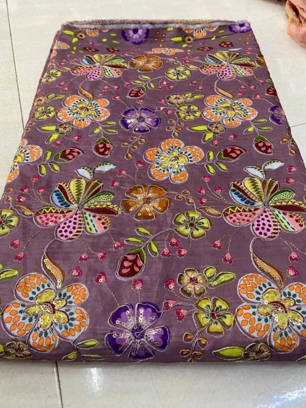 What truly sets this fabric apart is the intricate **position placement embroidery** featuring a captivating floral design. Unlike all-over patterns, the motifs are strategically placed, offering a modern, designer touch that allows for creative garment construction, such as highlighting the yoke, sleeves, or hemline of a Kurti, an Anarkali, or a Lehenga. The meticulous embroidery work adds a rich, tactile dimension and a subtle shimmer, catching the light beautifully without being overly flashy. This artful placement is a mark of high-end couture, bringing an exclusive appeal to your wardrobe. The ‘Dusty Magenta’ color is a sophisticated alternative to brighter pinks, offering a regal and understated elegance.