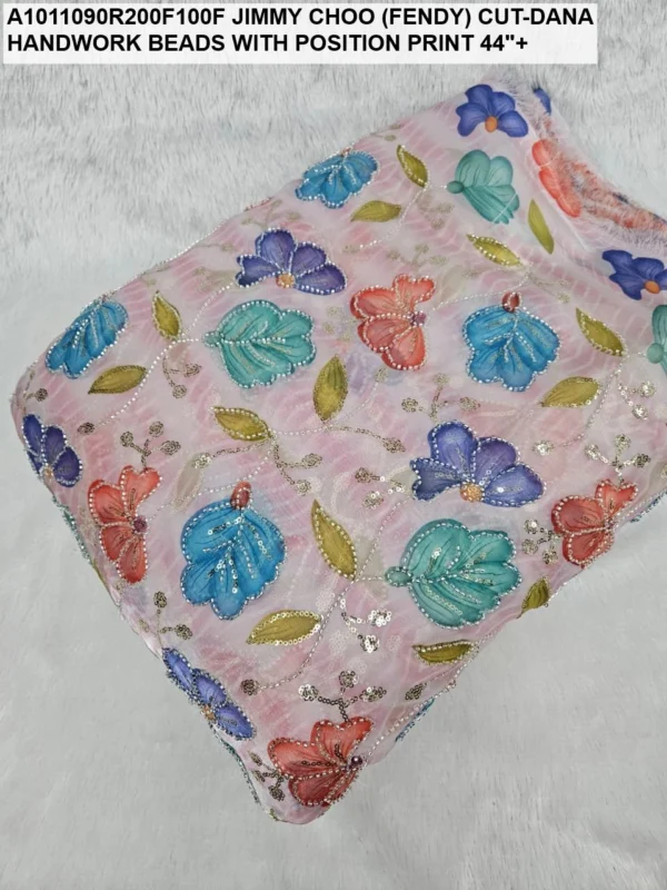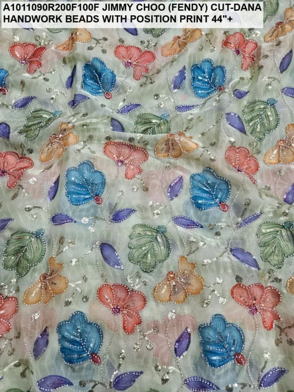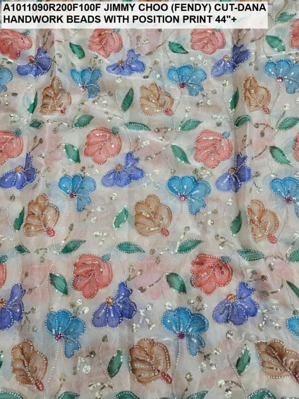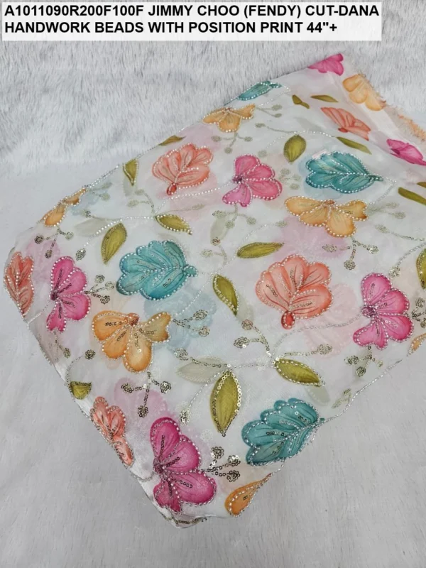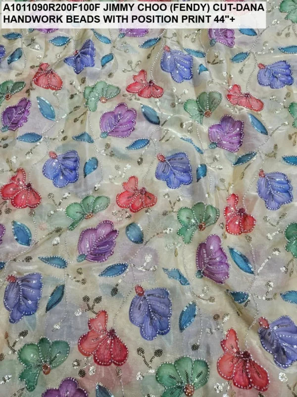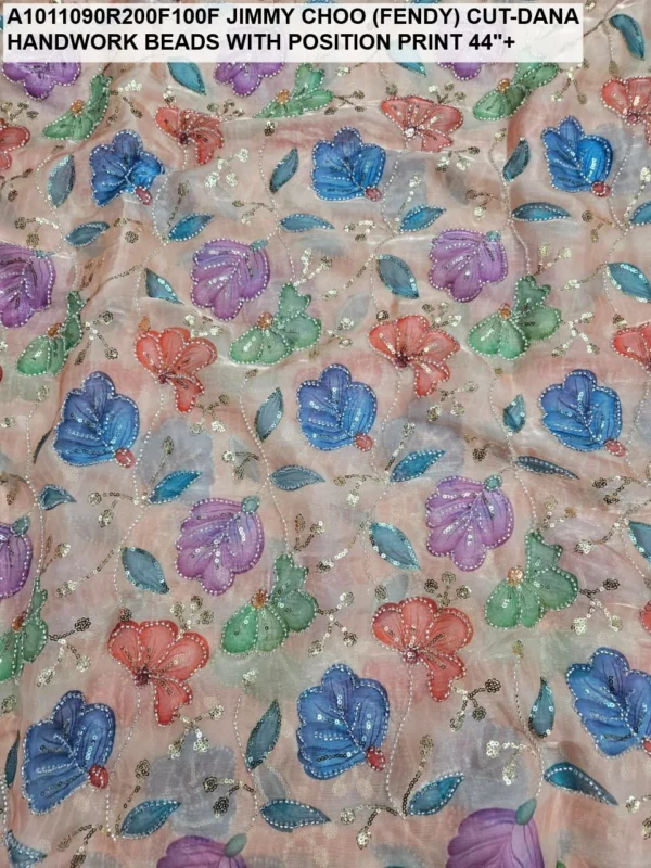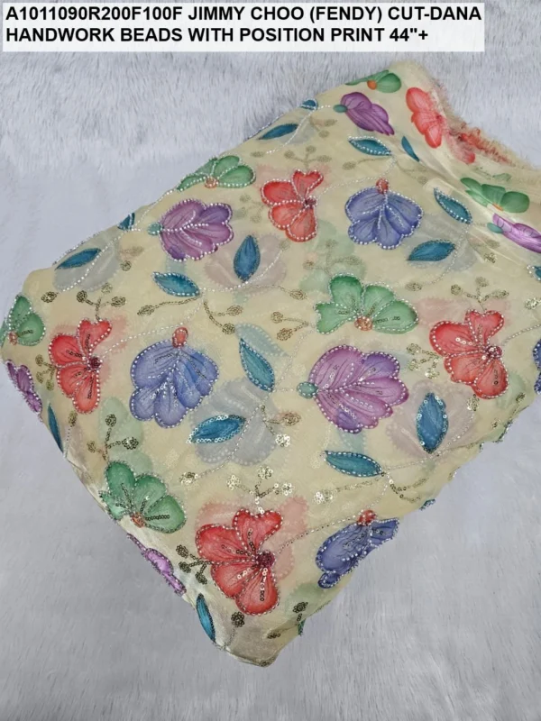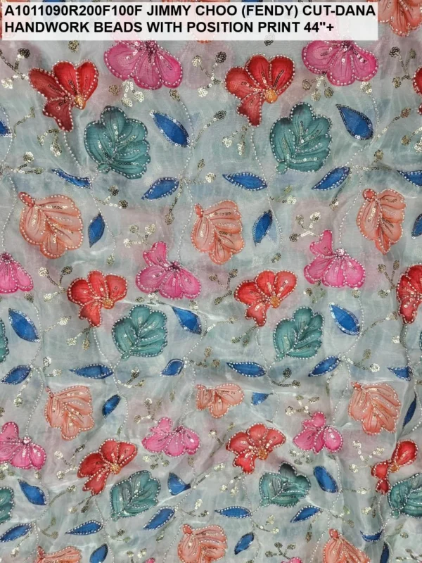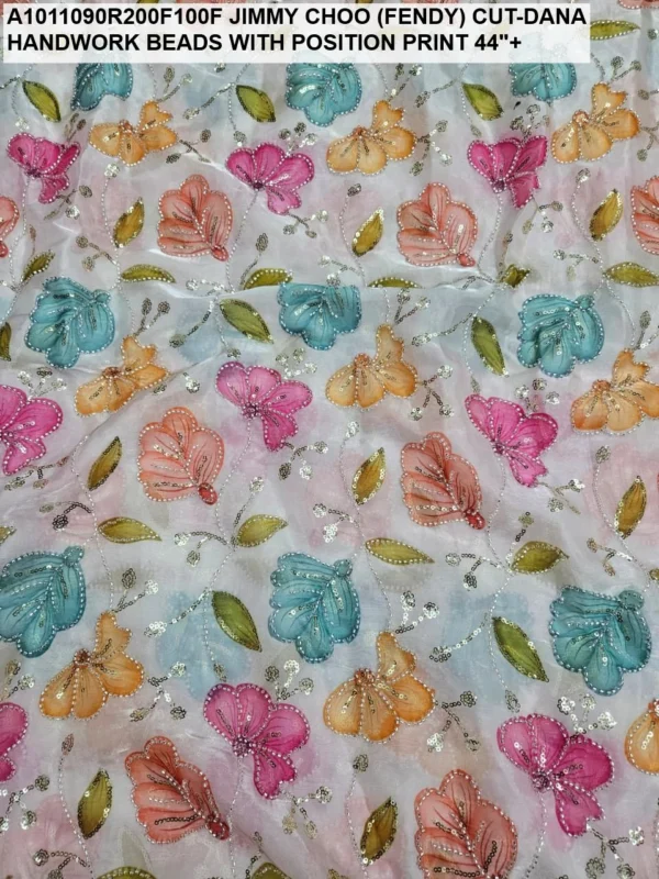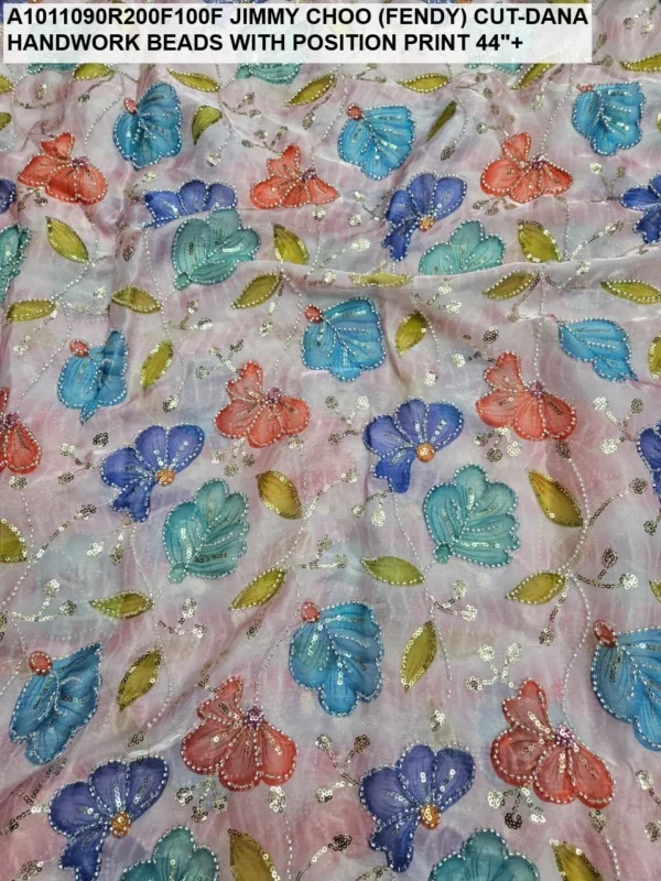 Crafted on a high-quality Jimmy Choo (often referred to as Fendi) base, this fabric is known for its incredible sheen and fluid drape. Unlike standard prints, our position print technology ensures that the floral and abstract motifs are perfectly aligned with the hand-applied beadwork. Every meter reflects hours of meticulous labor, with shimmering glass beads (Cut-Dana) sewn to catch the light from every angle.