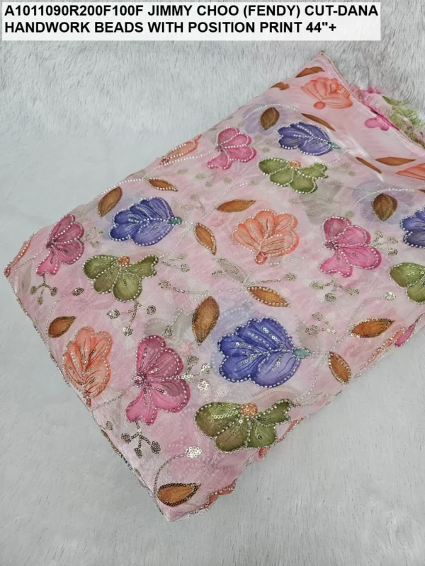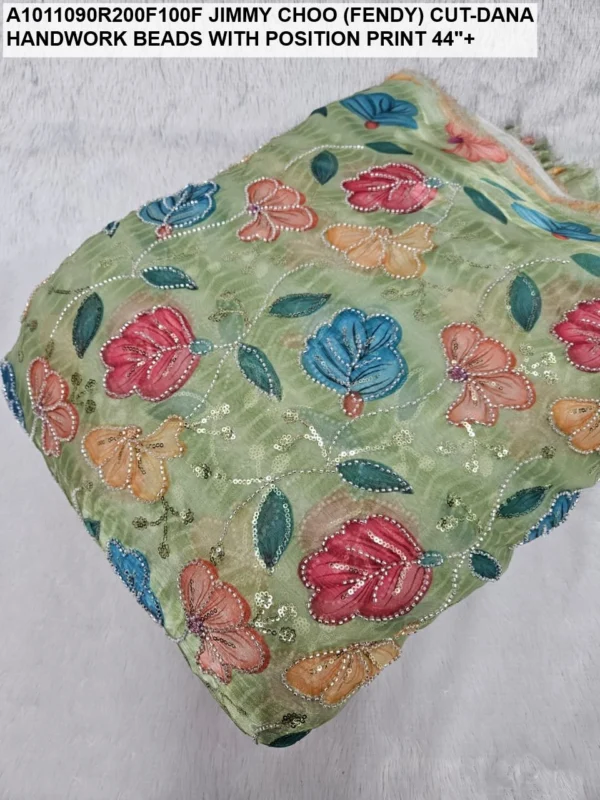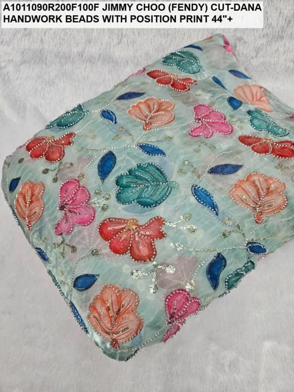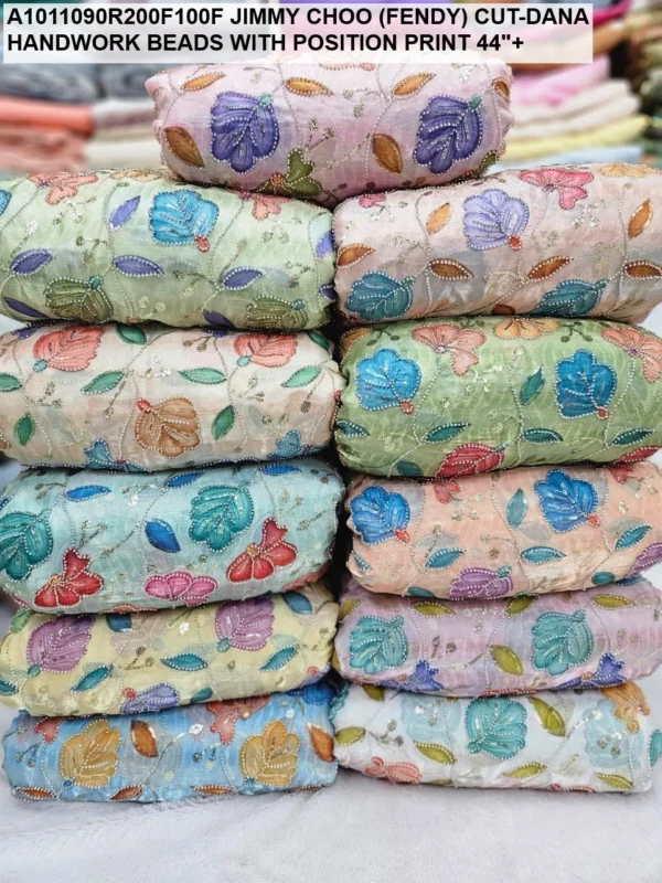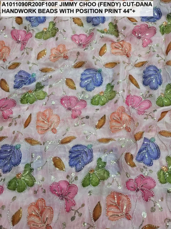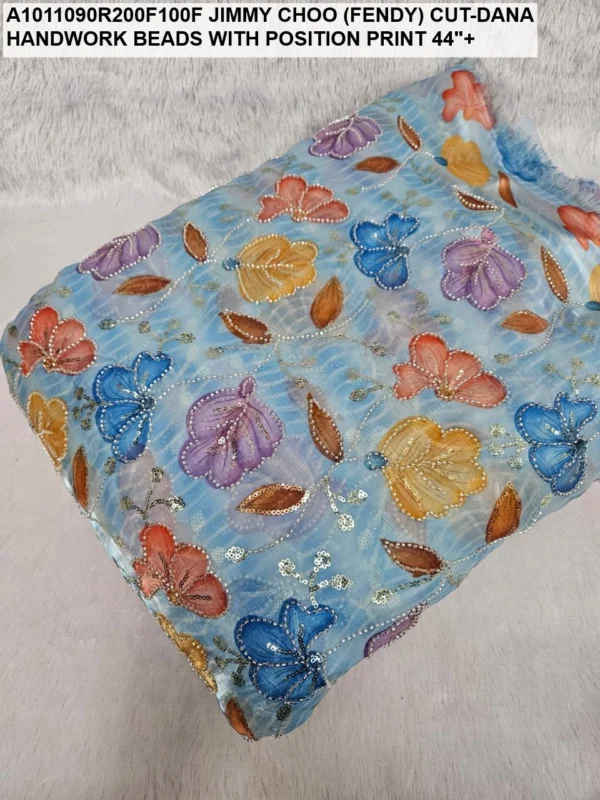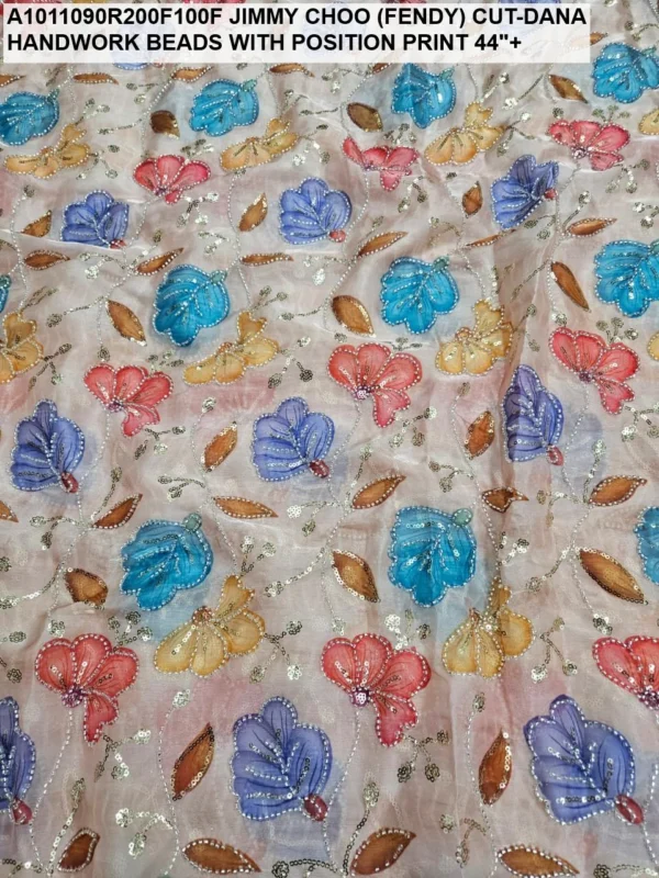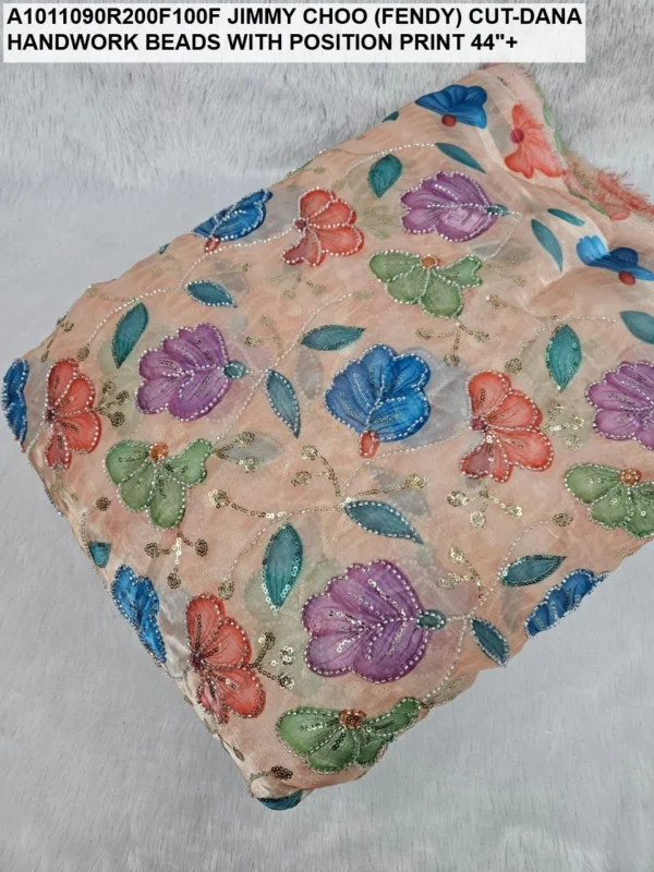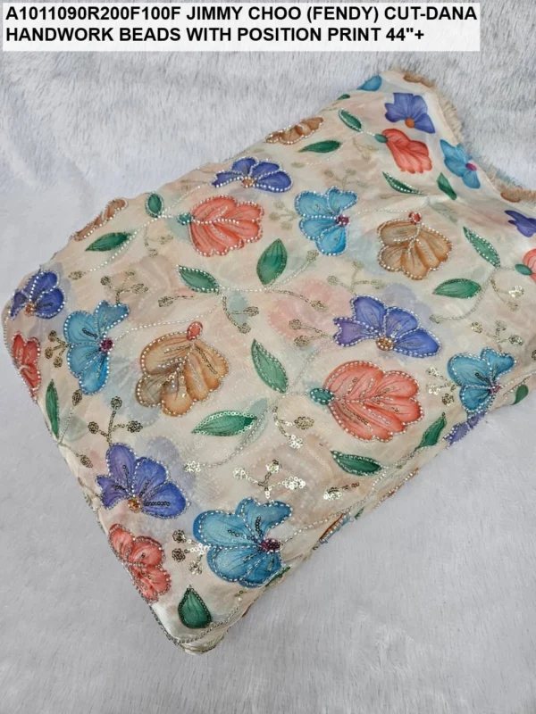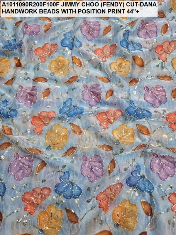 Crafted on a high-quality Jimmy Choo (often referred to as Fendi) base, this fabric is known for its incredible sheen and fluid drape. Unlike standard prints, our position print technology ensures that the floral and abstract motifs are perfectly aligned with the hand-applied beadwork. Every meter reflects hours of meticulous labor, with shimmering glass beads (Cut-Dana) sewn to catch the light from every angle.