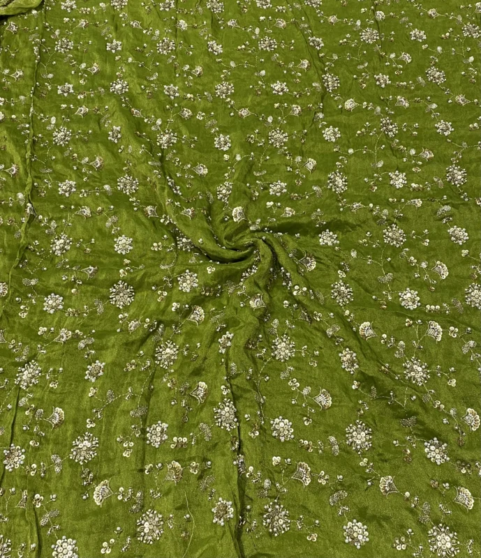 Leaf Green Shimmer Tissue Silk Fabric with Pearls & Sequins Beads – Pure, Soft & Classy for Designer Party Wear