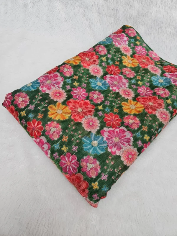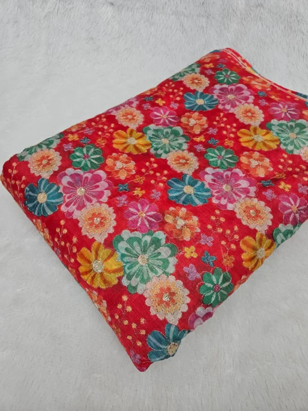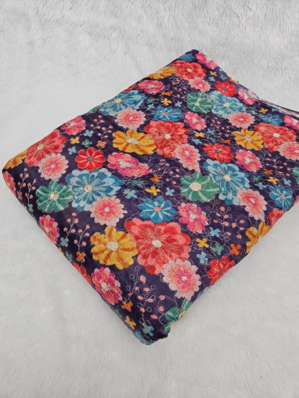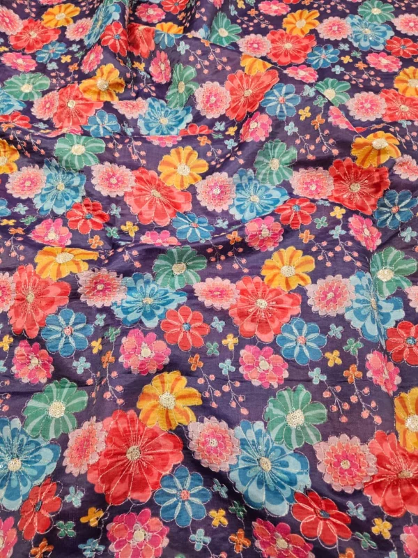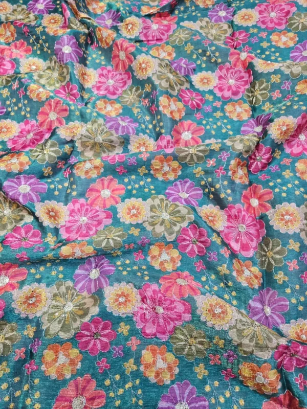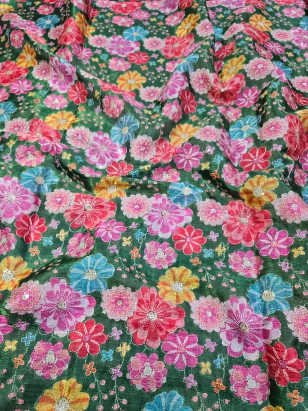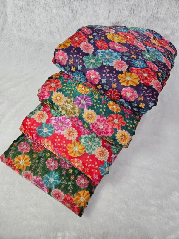 Imagine designing a breathtaking lehenga with a beautifully embroidered skirt that flows with every step, or a graceful saree with a stunning pallu that makes a statement. Our Crushed Jimmy Choo fabric with embroidered position prints is versatile enough for all your fashion needs. It is an excellent choice for bridal gowns, festive kurtis, and even chic cocktail dresses. The quality and design of this fabric ensure that your creation will stand out from the crowd.