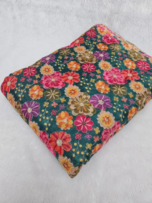 Our Crushed Jimmy Choo fabric is meticulously crafted to ensure a superior finish. The fabric’s signature crushed effect provides a graceful drape that is perfect for flowy silhouettes like Georgette sarees and voluminous lehengas. The highlight of this material is the “position print” embroidery, where the design is strategically placed to enhance the garment’s visual appeal. This thoughtful detailing means less work for you and a more polished, professional result. The embroidery is done with fine threads, creating intricate patterns that catch the light beautifully, making it ideal for evening wear, festive occasions, and bridal attire.