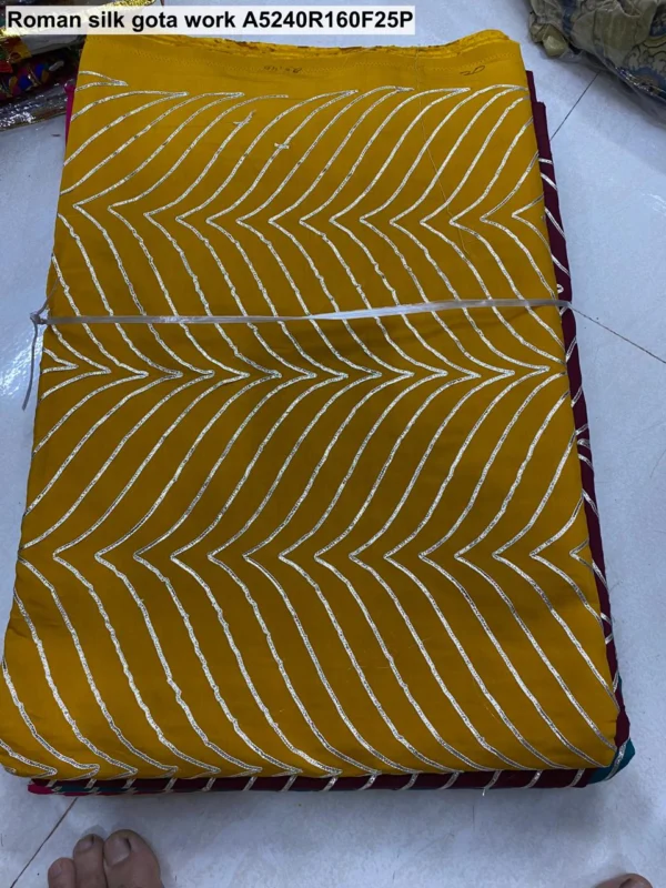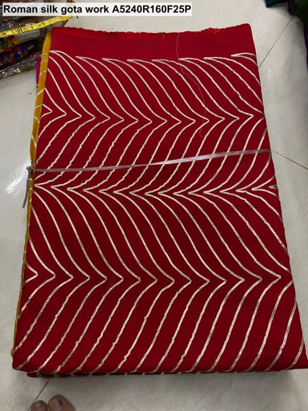 This Roman Silk Gota Patti fabric is a favorite for 2025 wedding trends. Use it to create a statement Gota work lehenga with a heavy 6-meter flair, or design a sleek Gota Patti saree for a sophisticated evening look. For a coordinated ensemble, pair it with our Pure Natural Crepe Fabric or explore more royal textures in our Roman Silk Collection.