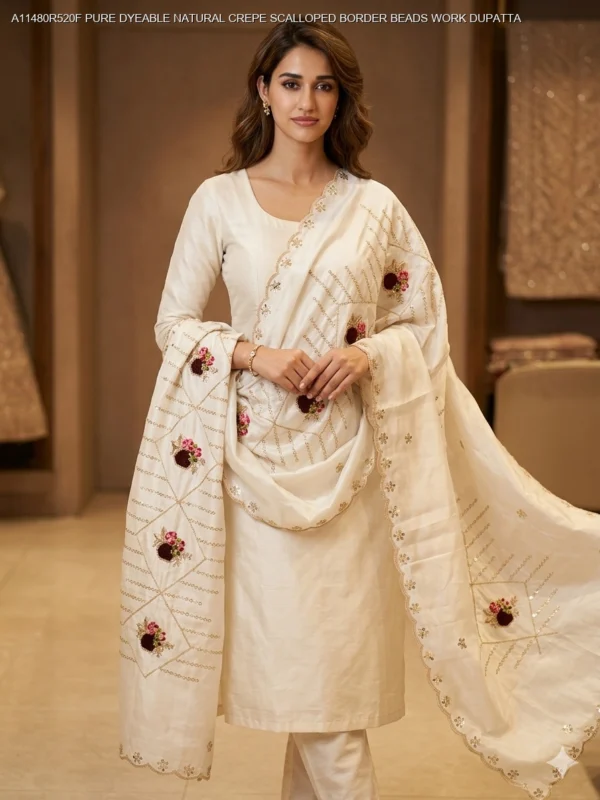 Introducing a masterpiece of craftsmanship—the Pure Dyeable Natural Crepe Dupatta. This luxurious accessory is designed to add a touch of regal elegance to any ethnic ensemble. Crafted from high-quality natural crepe, it offers a soft, pebbled texture and a fluid drape that moves gracefully with you. The highlight of this piece is its exquisite scalloped border, meticulously finished with delicate beads work that catches the light for a subtle, sophisticated shimmer.