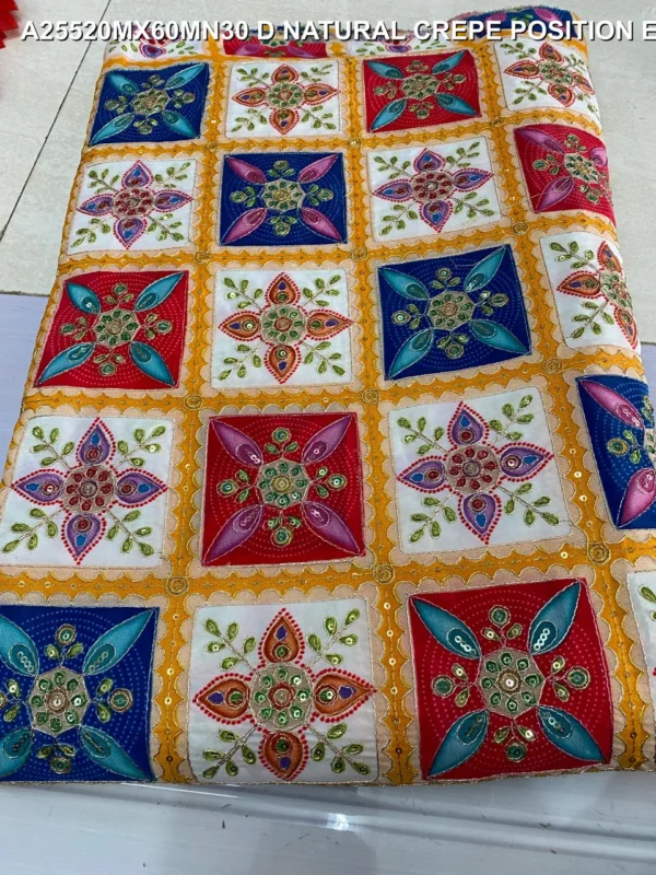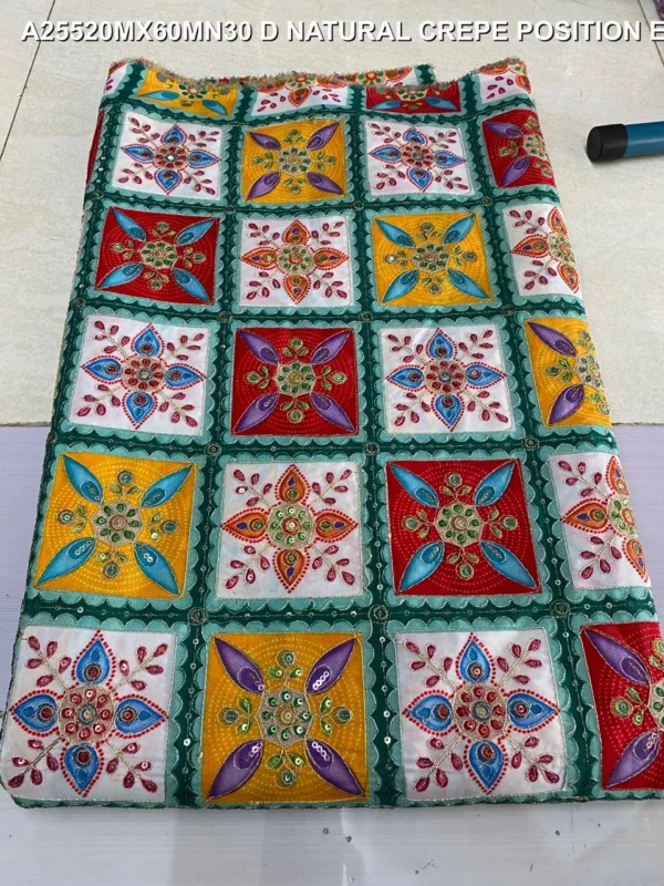 Ready to transform your next collection? Explore our wholesale offer on Pure Natural Crepe Position Print Embroidery Fabric today and place your bulk order!