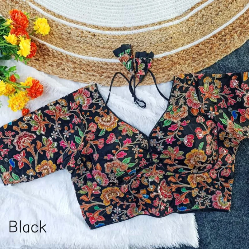 Shop the latest Readymade Pure Natural Crepe Sabyasachi Style Position Print Blouse with heavy Taar Codding & Sequence Embroidery. Padded, Free Size 38. Shop Now!