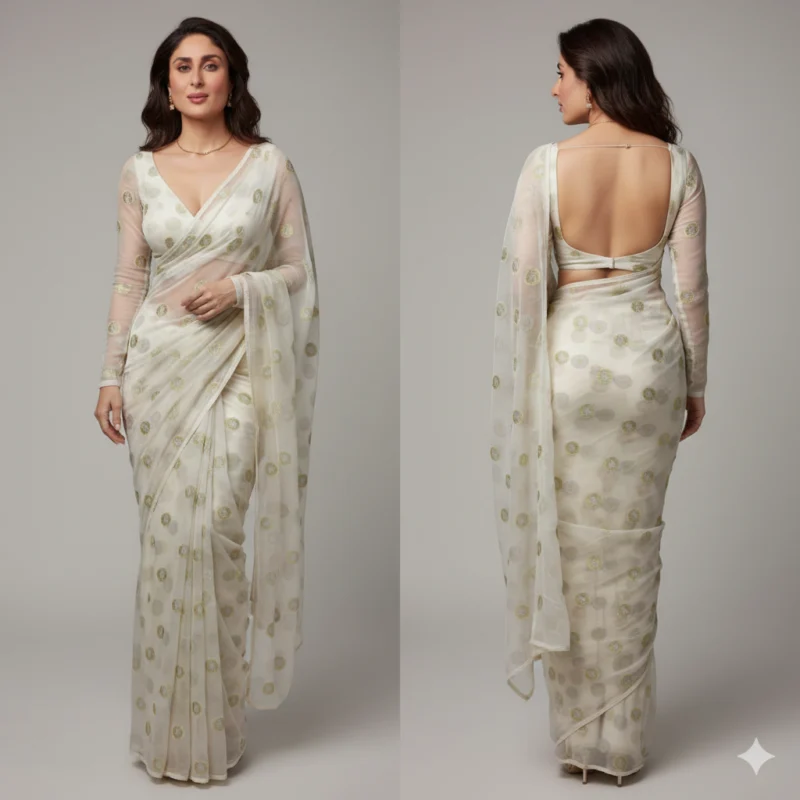 - Best for Bollywood Sarees: Its sheer texture, elegant fall, and Banarasi work make it the quintessential choice for recreating iconic Bollywood saree looks, from classic retro styles to modern celebrity drapes.