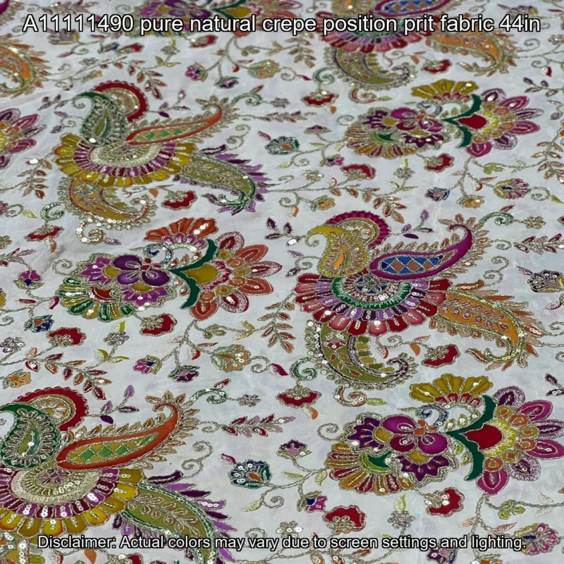 Step into a world of sophisticated style and unparalleled comfort with our exquisite Pure Natural Crepe Fabric with Position Print and Embroidery. Crafted from the finest natural crepe fibers, this fabric offers a luxurious drape, a remarkably soft hand-feel, and a subtle textured finish that is both elegant and versatile. Perfect for designers and home sewers alike, this fabric is your canvas for creating masterpieces that truly stand out.