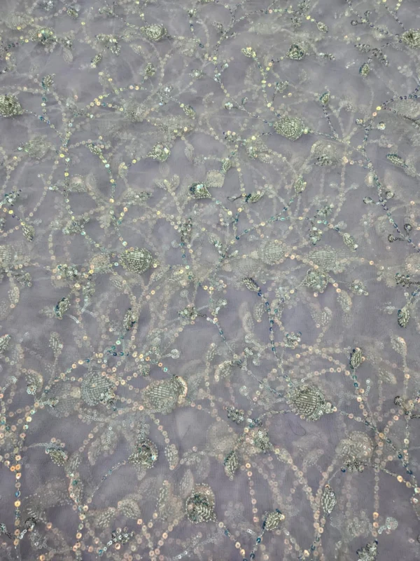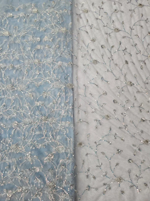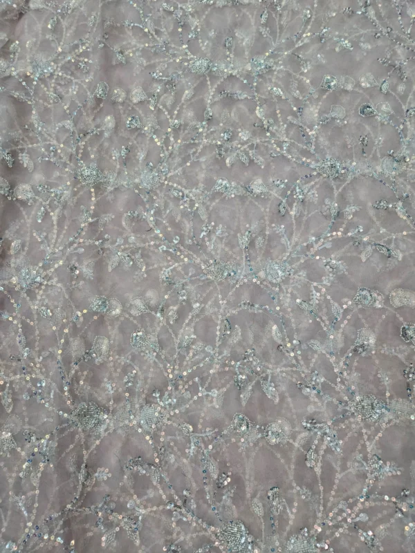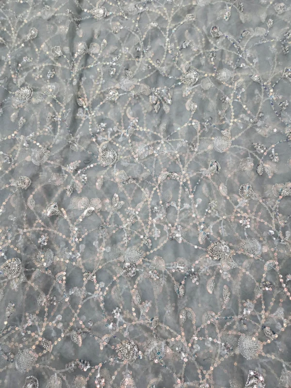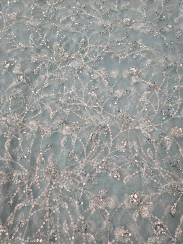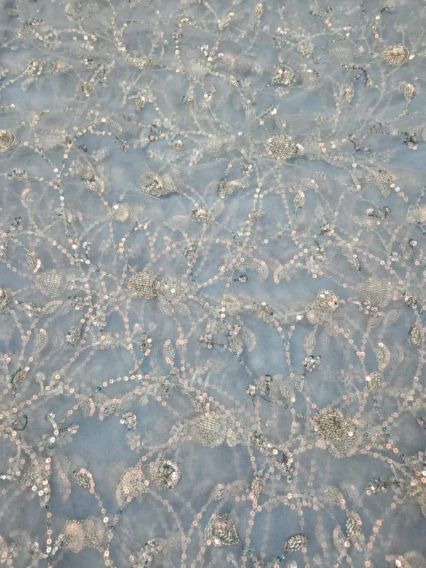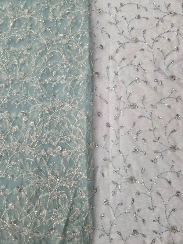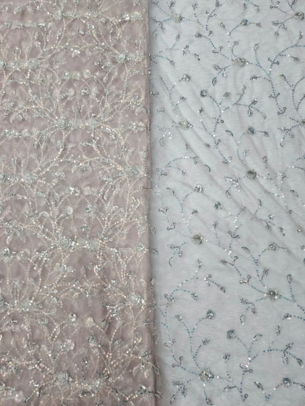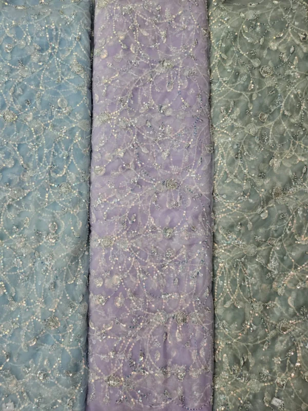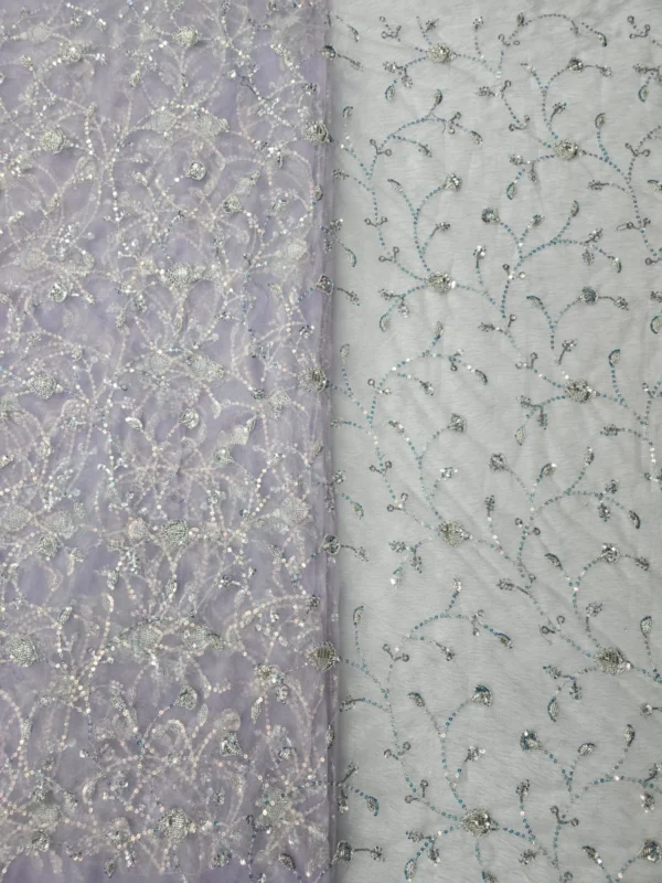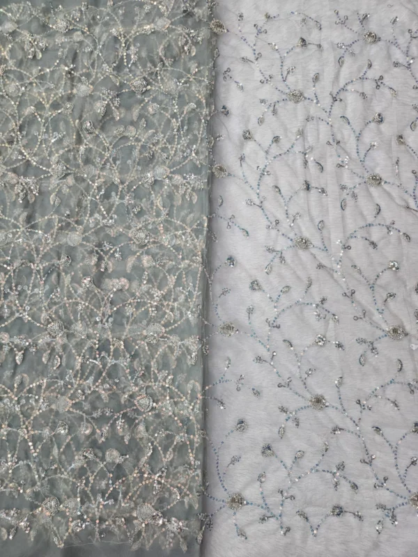 Our Butterfly Net fabric stands out due to its superior quality and the detailed hand-embroidery. The beadwork is carefully placed to create stunning patterns that catch the light, giving your outfit a subtle, glamorous shimmer. With a generous width of 56″+, you have a wide canvas to bring your most creative designs to life. This fabric is ideal for various applications, including bridal wear, festive attire, and evening gowns. The handwork adds a unique, artisanal touch that cannot be replicated by machines, making each piece you create truly special.
