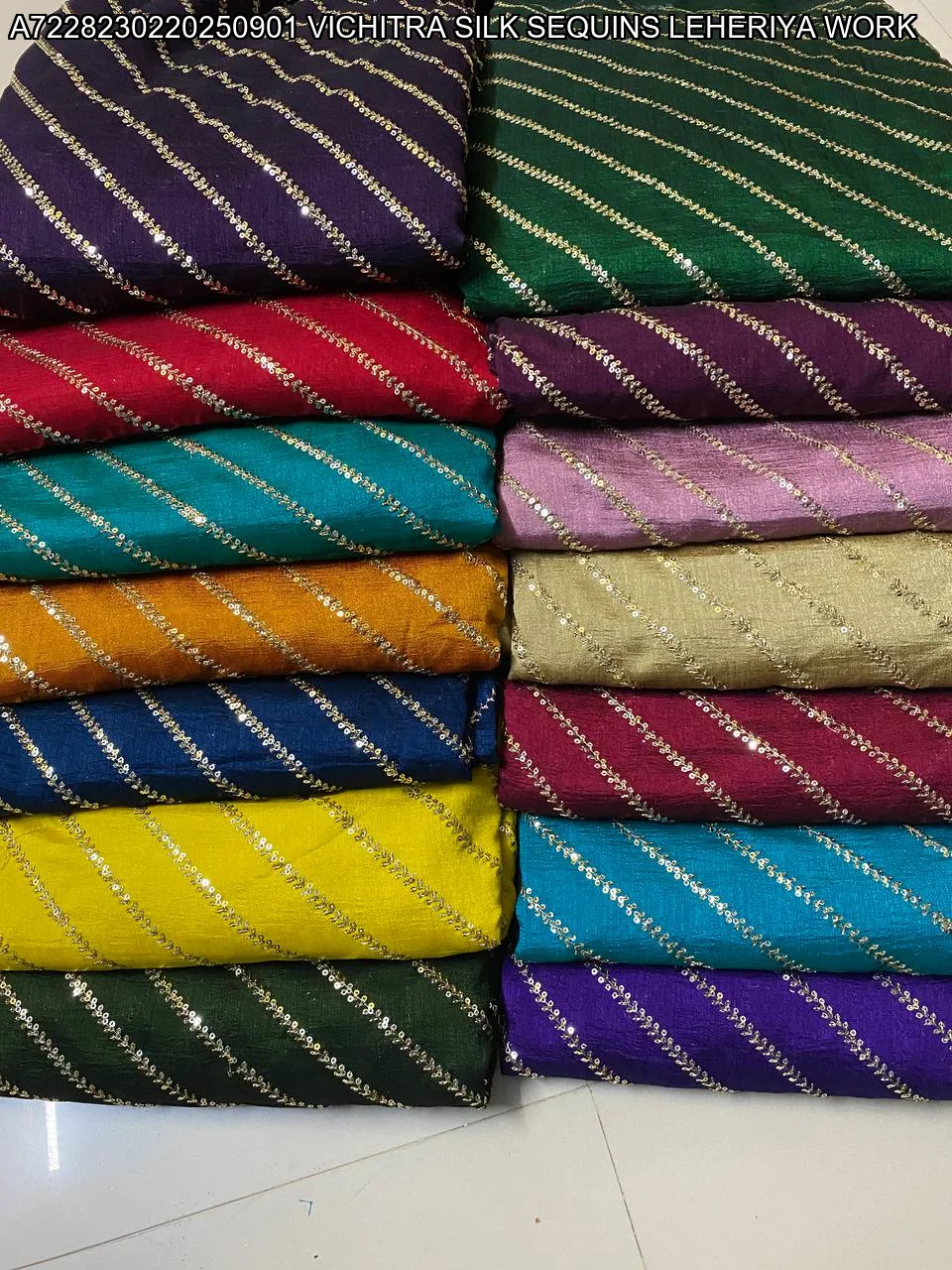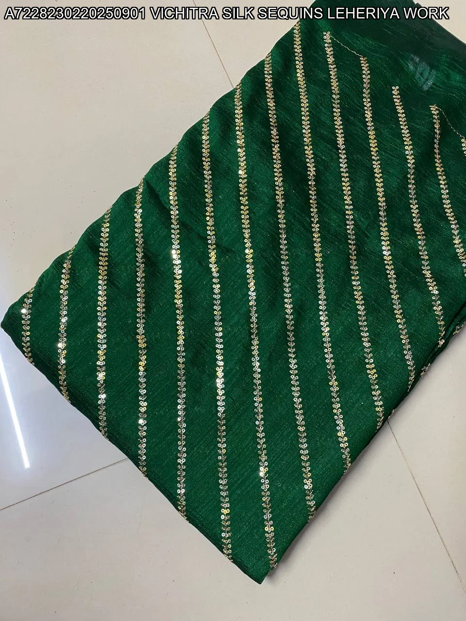 - Design: Traditional Leheriya pattern with sequin embellishments