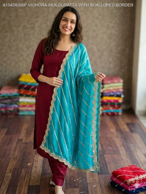 Take a cue from the latest celebrity trends and pair a contrasting Vichitra silk dupatta with a plain solid-colored silk kurta set. For instance, a teal scalloped dupatta looks breathtaking against a deep wine or maroon suit. Complete the look with statement jhumkas and mojaris for a classic yet contemporary Bollywood vibe. You can explore more about traditional Indian drapes and their history on Wikipedia.