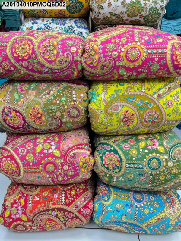 For discerning bulk buyers, boutique owners, and garment manufacturers, presenting a new benchmark in luxurious textiles: the **Wholesale Pure Natural Crepe Keri Print Placement Embroidery Fabric**. This is more than just fabric; it is a canvas of modern sophistication blended with timeless Indian artistry. Available exclusively for wholesale purchase at an exceptional value of **₹575 per meter**, this fabric ensures your next collection will stand out with unmatched elegance and premium quality. Elevate your line of designer suits, glamorous gowns, festive sarees, and contemporary kurtis with a material that truly speaks luxury.